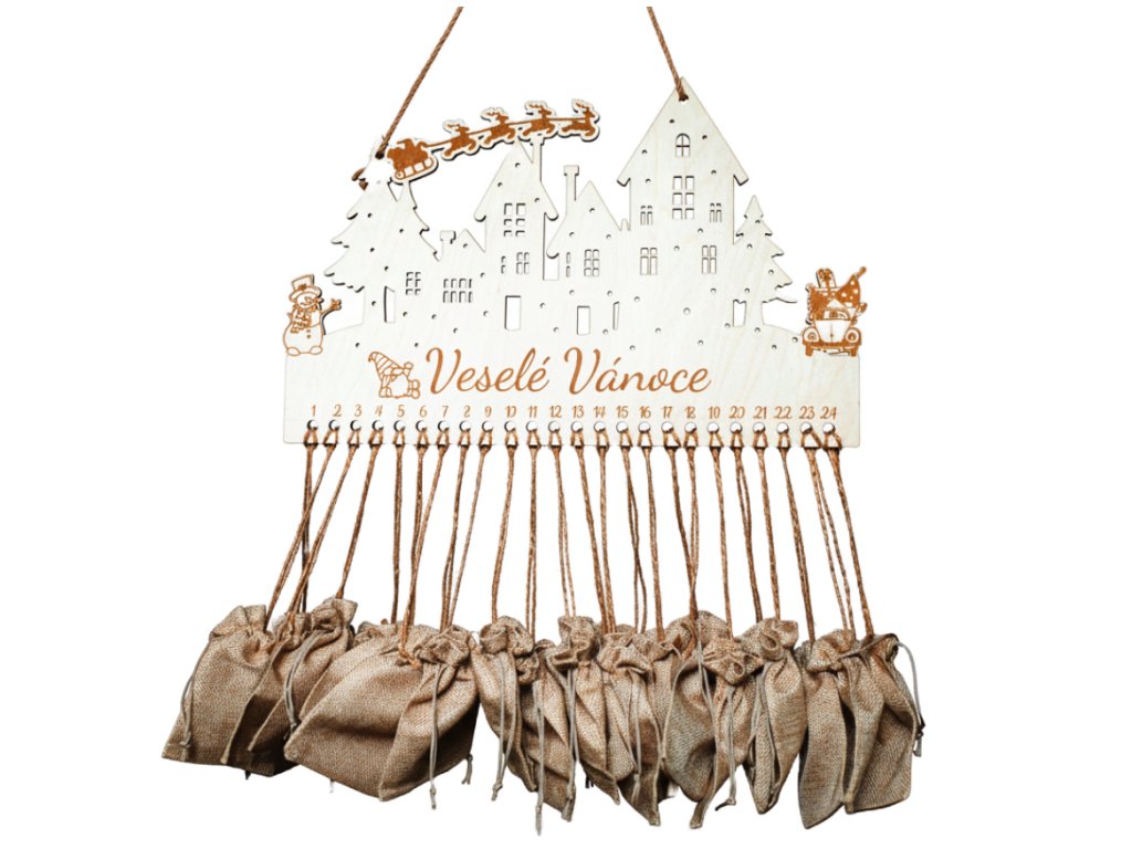 Připravte se na nejpohádkovější období roku s kalendářem, který v sobě skrývá 24 malých radostí! Náš závěsný adventní kalendář je vyroben z prvotřídního březového dřeva a je kompletně vybaven 24 jutovými pytlíčky, připravenými k naplnění drobnými dárky nebo sladkostmi. Je zdoben detailní vánoční krajinou s chaloupkami, sněhulákem a sobami, které táhnou sáně – tradiční dekorace pro moderní domov.