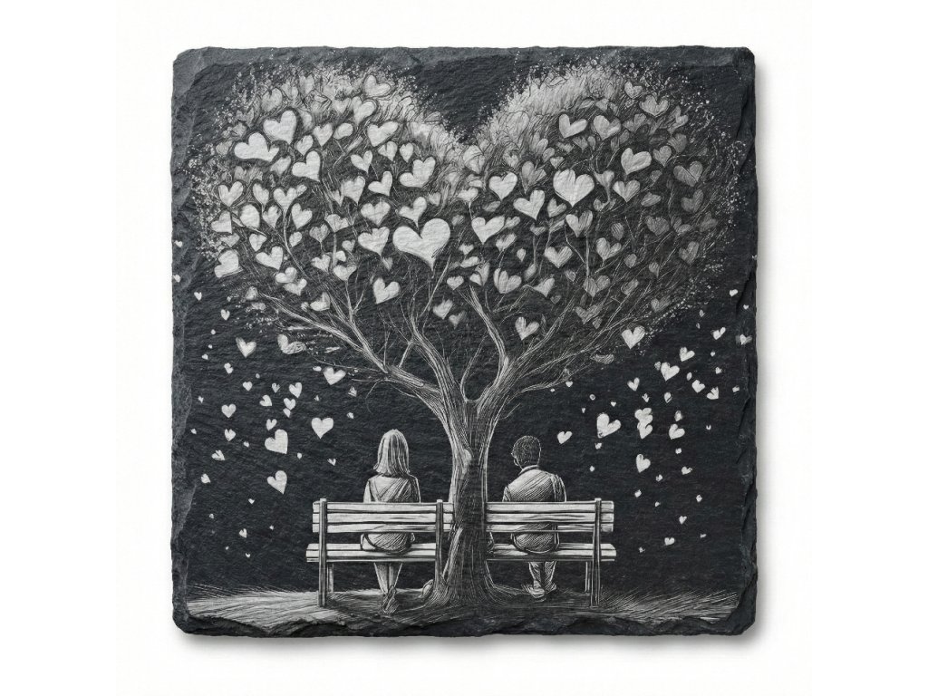 Láska, to jsou hluboké kořeny a pocit bezpečí, stejně jako u silného stromu. Náš břidlicový podtácek s motivem páru sedícího na lavičce pod košatou korunou stromu zachycuje přesně tu chvíli, kdy se zastaví čas a existujete jen vy dva. Tento kousek přírodního kamene vnese do vašeho domova kousek klidu a připomene vám, jak důležité je najít si čas na společné posezení.