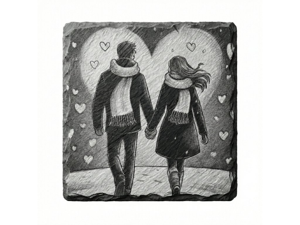 Nejhezčí cesta je ta, kterou jdete ve dvou. Náš břidlicový podtácek s gravírovaným motivem zamilovaného páru, který kráčí ruku v ruce vstříc velkému srdci, je oslavou partnerství a vzájemné opory. Tento kousek přírody na vašem stole vám při každém doušku kávy nebo vína připomene, že na nic nejste sami a že láska je ten nejkrásnější cíl.