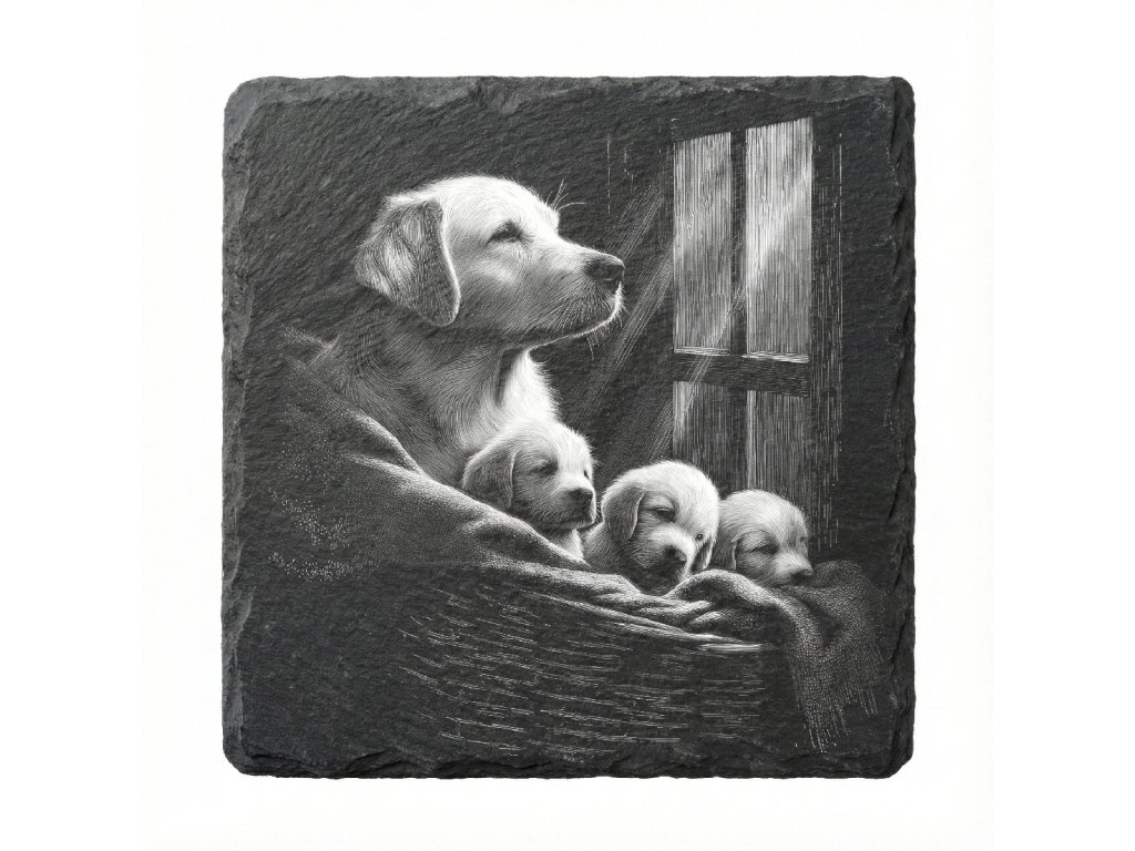 Dojemný rodinný motiv: Scéna dospělého psa s jeho třemi štěňátky je symbolem něhy a věrnosti. Precizní laserové gravírování vynikne v kontrastu s tmavým kamenem.