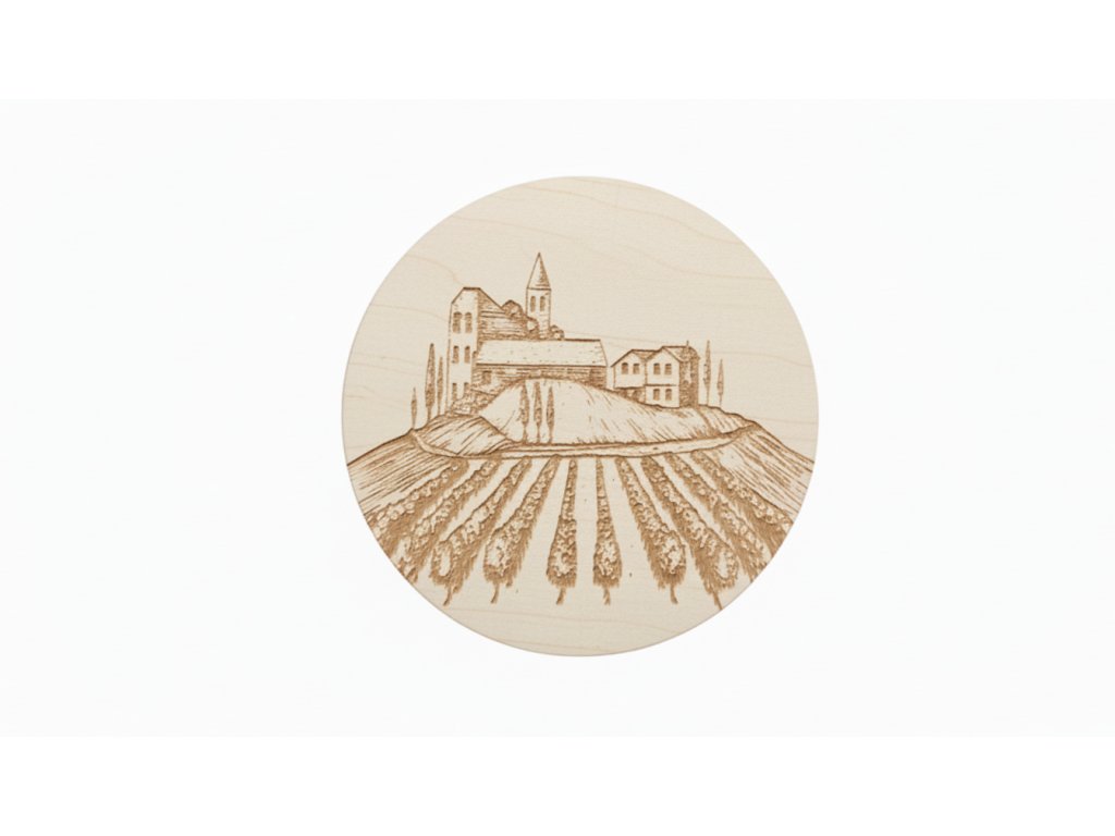 Přineste si domů kus malebné krajiny, slunce a vinařské pohody! Tento dřevěný podtácek z březové překližky s precizním laserovým gravírováním motivu "Vinice na kopečku" je ideální pro ty, kteří milují víno, přírodu a klidné večery. Je to elegantní a vkusný detail, který vás přenese přímo do srdce vinohradu s každou sklenkou vína.