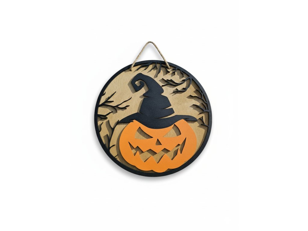 Přivítejte podzim a Halloween s neodolatelnou a magickou dekorací! Tento dekorativní kruh na zavěšení s laserovým designem "Pumpkin" představuje roztomilou oranžovou dýni, která si nasadila čarodějnický klobouk. Je to hravý a barevný prvek, který dodá vašim dveřím tu správnou, veselou a mystickou halloweenskou atmosféru.