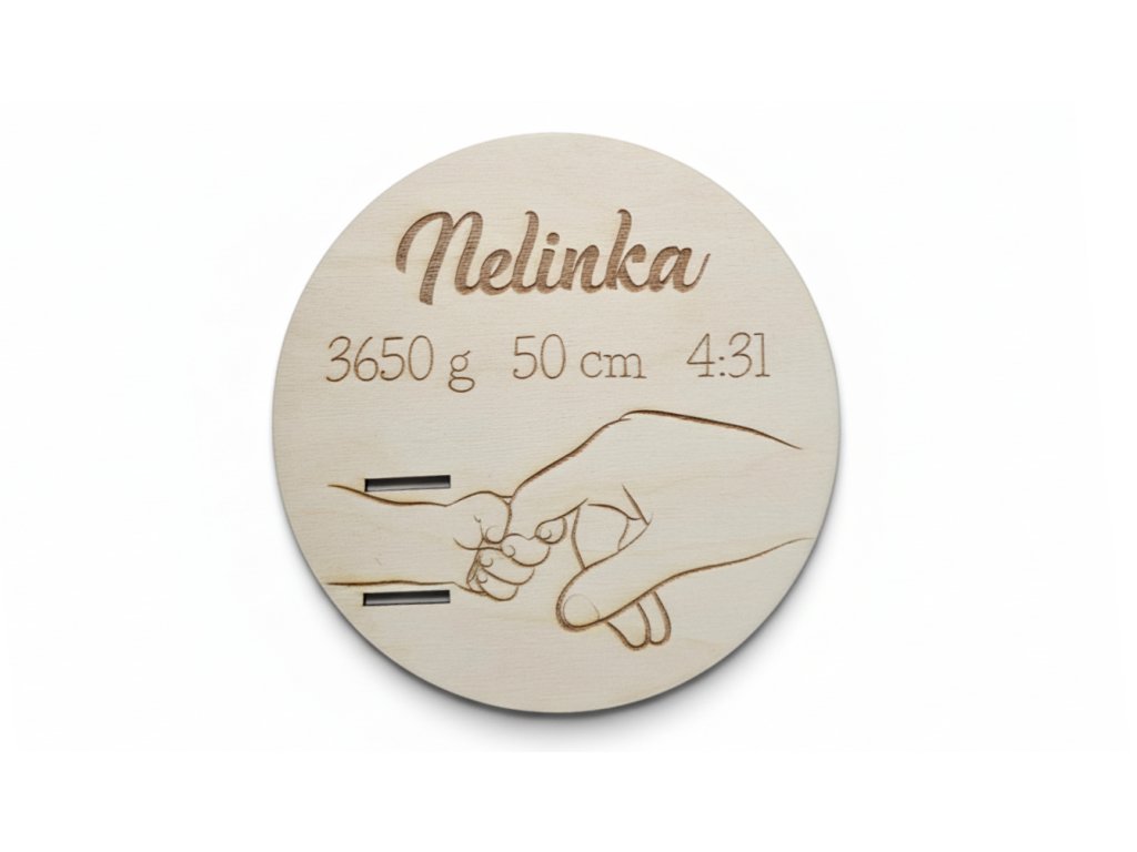 Uchovejte si nejemotivnější a nejvzácnější vzpomínku na příchod Vašeho miminka na svět! Náš dřevěný kruh z březové překližky je navržen speciálně pro to, aby se stal originálním rámečkem pro náramek z porodnice. Navíc Vám jej vyrobíme na míru se všemi údaji, takže vznikne dokonalá a trvalá památka.