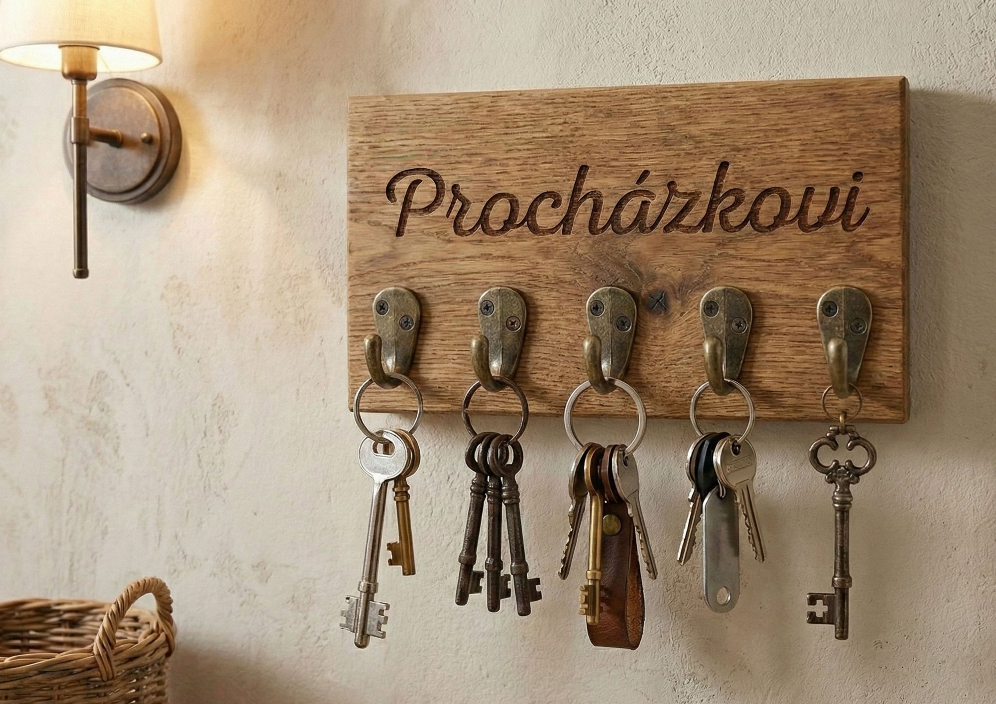 Věšáky na klíče: Praktická věc, která může vypadat skvěle. Gravírovaný věšák se jmény členů rodiny (nebo i jménem psa nad jeho vodítkem) je detail, který návštěvu zaujme hned ve dveřích.
