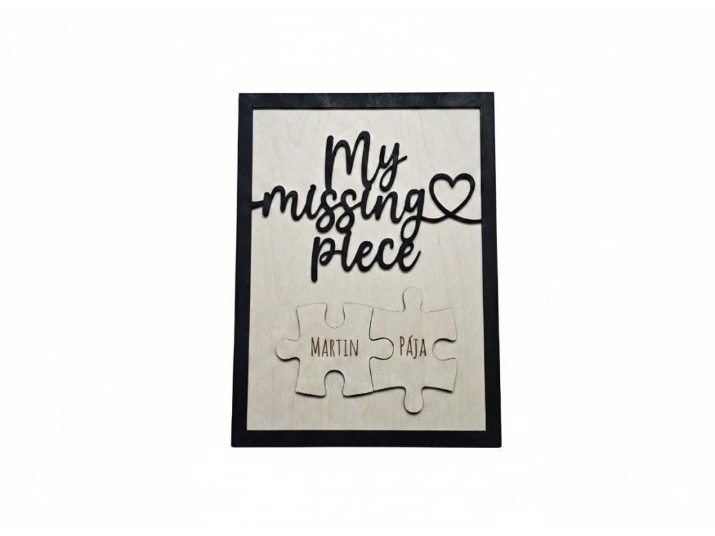 Láska je jako skládačka – když najdete ten správný dílek, najednou všechno dává smysl. Náš dvouvrstvý dřevěný obraz s nápisem „My missing piece“ (Můj chybějící kousek) je nádherným symbolem tohoto spojení. Ústředním motivem jsou dva do sebe zapadající dílky puzzle, na které vygravírujeme vaše jména. Vytvořte si doma připomínku toho, že vy dva k sobě prostě patříte.
