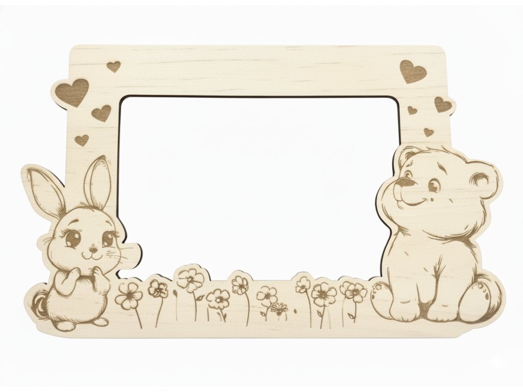 Uchovejte si ty nejkrásnější chvíle z dětství Vašich nejmenších v originálním a hřejivém fotorámečku! Náš dřevěný rámeček o velikosti 10x15 cm je zdoben roztomilými motivy z obou stran – na jedné straně se usmívá zajíček obklopený srdíčky, na druhé zase něžný medvídek se srdíčky. Celkový design doplňují dole vyřezané kytičky, což z něj dělá dokonalý doplněk do dětského pokoje.