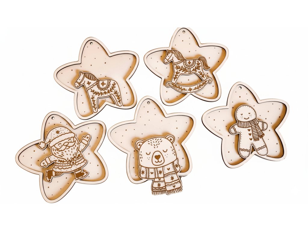 Vneste na svůj vánoční stromeček jedinečný, hřejivý a rustikální nádech! Naše sada 5 vrstvených ozdob ve tvaru hvězdy je vyrobena z kvalitní březové překližky. Díky dvěma slepeným vrstvám získávají ozdoby elegantní 2D efekt, a každá z nich skrývá jiný, hravý vánoční motiv.