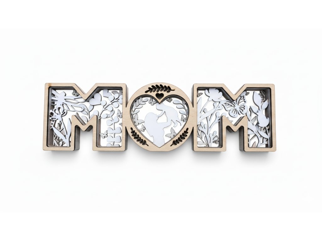 Hledáte originální a hřejivou dekoraci, která vzdá hold té nejdůležitější osobě na světě? Náš vrstvený nápis MOM je unikátní 3D obraz sestavený z pěti vrstev březové překližky. Písmeno „O“ je vkusně nahrazeno siluetou maminky, která drží dítě nad hlavou, což symbolizuje bezpodmínečnou lásku, radost a ochranu.