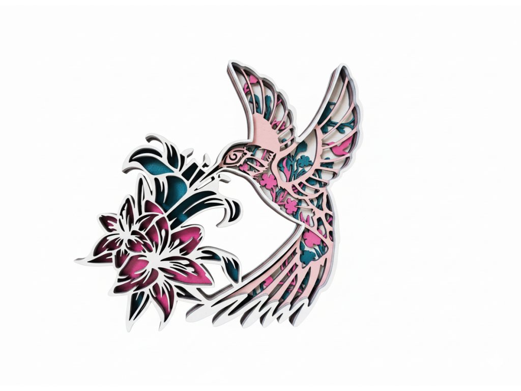 Dynamický 3D Efekt: Díky pěti vrstvám březové překližky získává silueta kolibříka neuvěřitelnou hloubku, dynamiku a lehkost. Jednotlivé vrstvy dodávají obrazu detail a texturu.