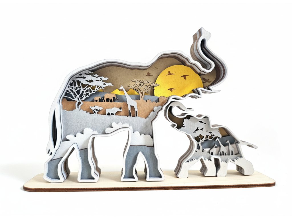Extrémní 3D Hloubka: Díky sestavení z rekordních devíti vrstev získá silueta sloní rodinky vizuálně největší možnou 3D hloubku a plastický efekt. Každá vrstva dodává obrazu unikátní detail.